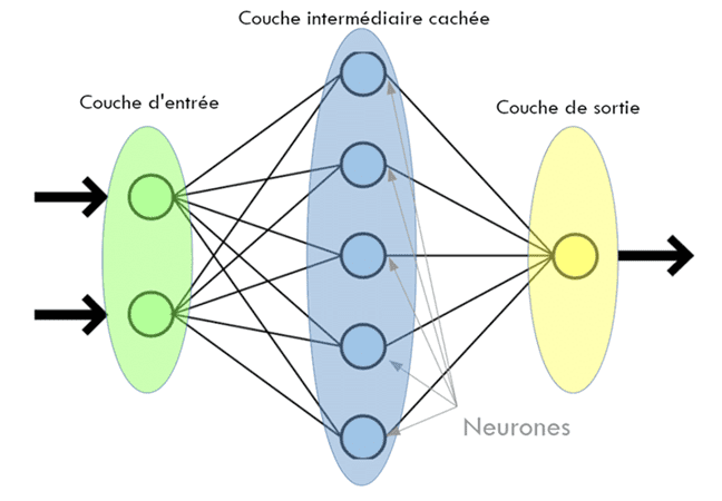 - Couches cachées : extraient des caractéristiques de plus en plus abstraites. Il peut exister plusieurs couches cachées.